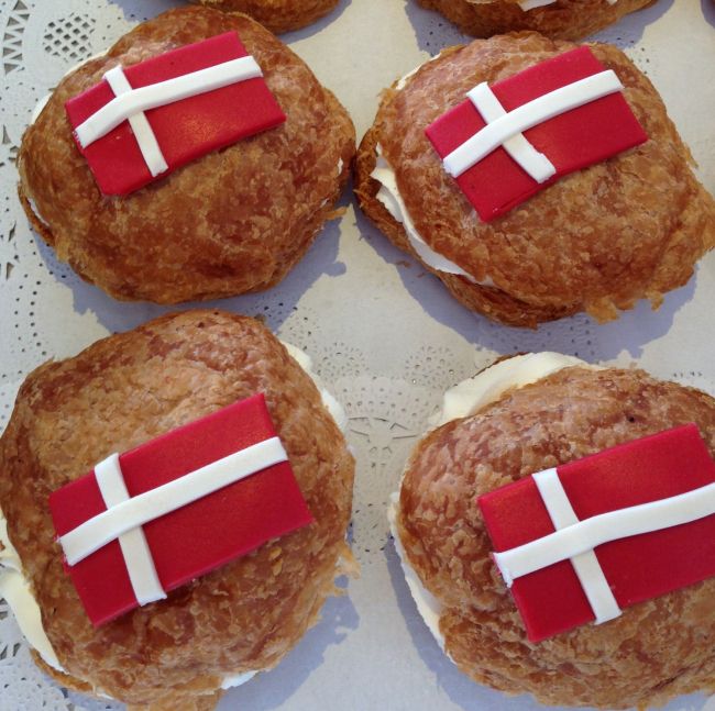 Lækker luftig wienerbrødsbolle med creme, hindbærmarmelade og flødeskum.