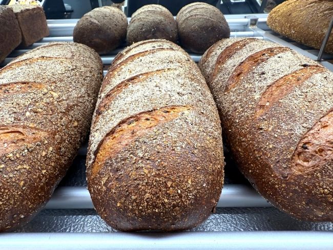 Koldhævet brød med super god smag og salt på toppen. Sprød skorpe.