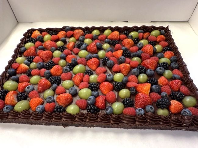 Chokoladebund med hindbærmousse, pyntet med frisk frugt.