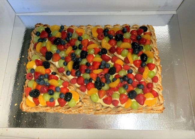 Lækker mazarinbund med flødecreme, kransekage og frisk frugt.