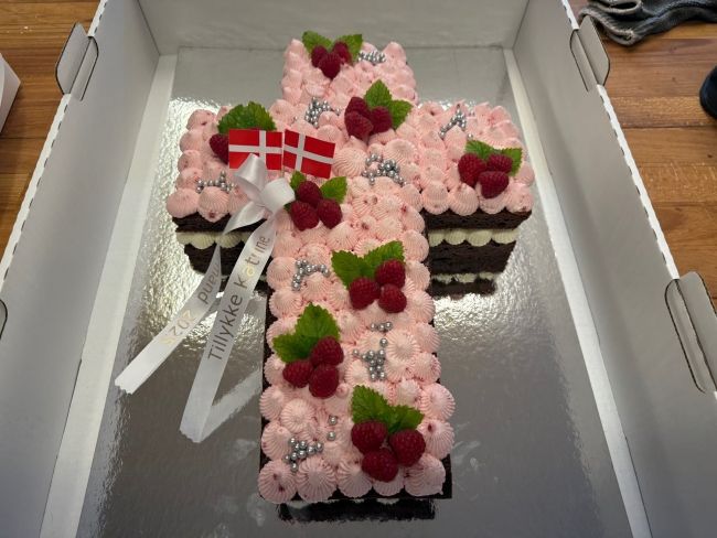 NAVN på konfirmanden skrives i kommentarfeltet. Så laver vi et guld bånd til kagen.